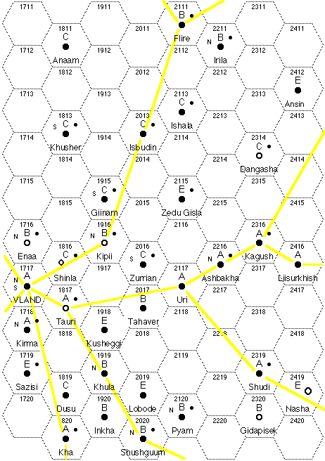 Hex | Name | UWP | BS | Trade | PPG | AL | Stellar |