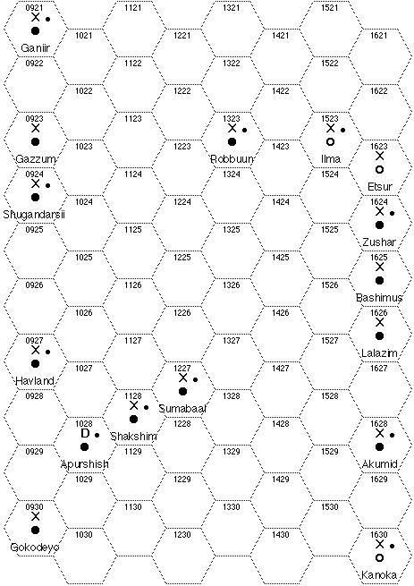 Hex | Name | UWP | BS | Trade | PPG | AL | Stellar |