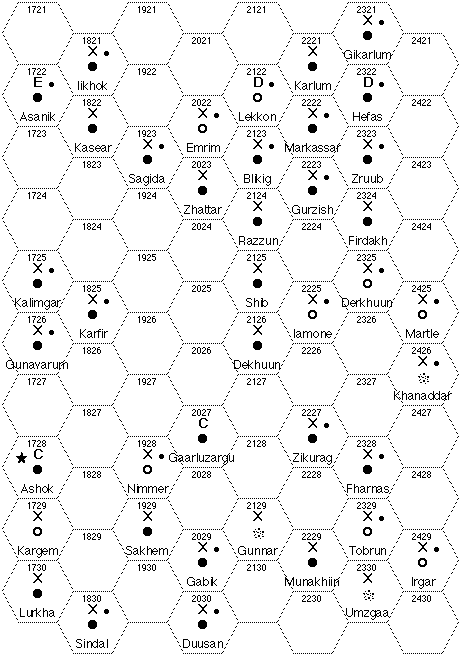 Hex | Name | UWP | BS | Trade | PPG | AL | Stellar |